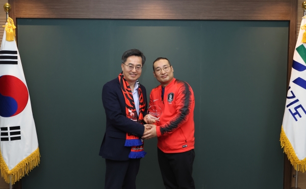[광성일보] 붉은악마와 2022 카타르월드컵 대한민국 대표팀의 시민응원전을 공동주관한 김동연 경기도지사가 붉은악마 경기지부로부터 감사패를 받았다.이중근 붉은악마 의장, 노형규 경기지부장, 정하선 중부지부장은 13일 경기도지사 집무실을 찾아 “경기도가 2022 카타르 월드컵 단체응원에 아낌없는 지원으로 성공적인 응원이 진행됐고 경기도민들과 축구팬들에게 큰 감동과 즐거움을 선사했다”면서 “붉은악마 경기지부 회원의 감사의 마음을 이 패에 새겨드린다”며 감사패를 전달했다.