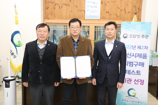 [광성일보] 광주도시관리공사(사장 박남수)는 조달청에서 주관하는 2022년 제 2차‘혁신시제품 시범구매 테스트 기관’으로 선정되어 혁신시제품을 무상으로 설치하게 되었다.혁신시제품 테스트 수행사업은 조달청에서 공공서비스 개선에 적용할 혁신시제품을 상용화 전 공공부분이 초기구매자가 되어 사용하고, 그 결과를 공개하여 공공성 및 사회적가치, 혁신성, 시장성 등을 평가하여 구매를 확산시키는 사업이다.