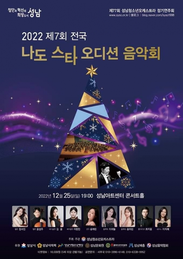 [광성일보] 민간단체로 창단 24년간 재정 행정적 어려움 속에서도, 한국예술비평가협회 청소년오케스트라 대상(大賞)을 수상한 바 있는, 성남청소년오케스트라(감독 겸 상임지휘자 박용준)가 주최하는, ‘2022 제7회 전국 나도스타 음악회’가 12. 25(일) 오후7시 성남아트센터 콘서트홀에서 열린다.성남청소년오케스트라 창단 24주년 기념 및 제77회 정기연주회를 겸한 이번 공연은, 지난 7월 비대면 동영상 심사를 거쳐 선발된 9명의 출연자의 열띤 경연과 연주로, 미래 음악계의 주역이 될 꿈나무들의 연주를 성남청소년오케스트와 함께하는 뜻 깊은 기회가 마련된다.