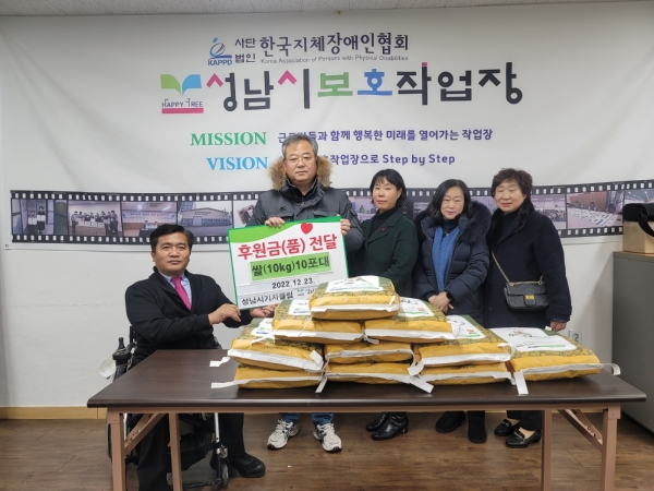 성남시기자클럽(대표 조정환)은 성남시보호작업장(원장 정기영) 찾아 장애인근로자들에게 따뜻한 마음을 전하고자 2022년 연말을 앞두고 작업장을 방문하여“사랑의 쌀(10kg) 10포대”를 후원하였다.이번에 후원받은 쌀 10포대는 연말행사에 사용되며 시루떡, 떡국떡을 제작하여 근로자들과 함께 따뜻한 연말을 보낼 예정이다.
