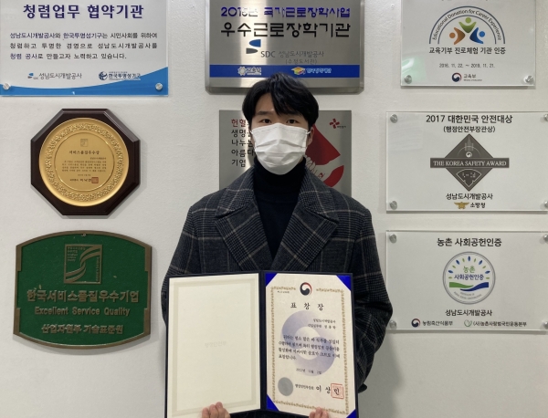 [광성일보] 성남도시개발공사(사장 정건기, 이하 공사)는 정보전략실 정종탁(일반7급) 직원이 행정안전부의 ` 2022년 행정정보 공동이용 활성화` 유공 장관표창을 수상했다고 28일 밝혔다.앞서 공사 정종탁 직원은 정보전략실 정보기획팀에 근무하며, 행정정보공동이용 활성화를 위해 공사 업무 현황에 최적화된 주차관제시스템·무인발권기·웹사이트 등 자동 감면할인 시스템을 자체 개발한바 있다.