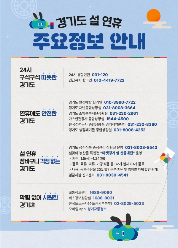 [광성일보] 경기도가 안전하고 편안한 명절을 위해 ‘설 맞이 종합대책’을 추진한다. 이번 종합대책은 10.29참사와 같은 비극이 다시는 일어나지 않도록 다수 인파가 몰리는 명절 기간 중 사회안전망 강화 등에 초점을 맞추고 있다.도는 21일부터 24일까지 ‘설 연휴 종합상황실’을 운영해 종합안내와 도민 불편 사항에 즉각적으로 대응할 계획이다. 연휴기간 발생하는 각종 불편 사항은 ‘120 경기도콜센터(031-120)’로 신고할 수 있다. 센터는 각종 불편 사항 접수는 물론 교통정보 및 응급의료기관 등을 안내한다. 안전예방핫라인(010-3990-7722)과 긴급복지핫라인(010-4419-7722)도 상시 가동한다.