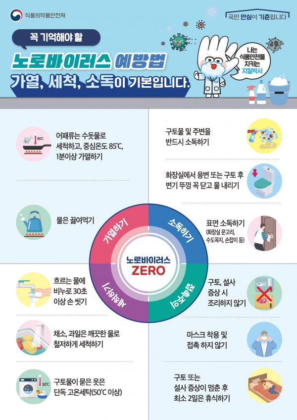 노로바이러스는 오염된 식품 섭취 시 2~4일이 지나 설사와 구토가 2~3일간 지속되며 낮은 발열, 탈수, 호흡기 증상을 일으키는 대표적인 바이러스 식중독균으로 전염성이 높은 질병이다.감염된 사람과 직·간접적 접촉만으로도 감염이 될 수 있어 이를 예방하기 위해 손을 깨끗이 씻고 음식은 충분히 익혀 먹고 과일·채소는 흐르는 물에 세척해 먹으며 물은 끓여 마시는 등 위생수칙을 잘 지켜야 한다.