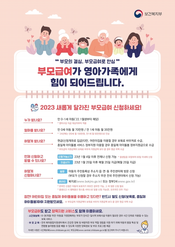 또한, 기존에 영아수당이나 보육료를 받고 있었다면 부모급여를 새로 신청할 필요는 없으나 어린이집에 다니는 만 0세의 부모가 부모급여 차액 18만6천원을 받으려면 은행계좌를 복지로 홈페이지에 입력해야 하며 종일제 아이돌봄서비스를 이용하는 경우에는 가구 소득 유형과 이용 시간에 따라 부모급여와 종일제 아이돌봄서비스 지원 중 더 유리한 지원 방식을 선택하면 된다.방세환 시장은 “부모급여 지원으로 출산가정의 아동 양육에 대한 경제적인 부담을 완화하고 안정적인 양육 환경이 조성되길 바란다”며 “양육과 더불어 보육의 질을 높일 수 있도록 다양한 보육사업을 추진하는 데 최선을 다하겠다”고 말했다.