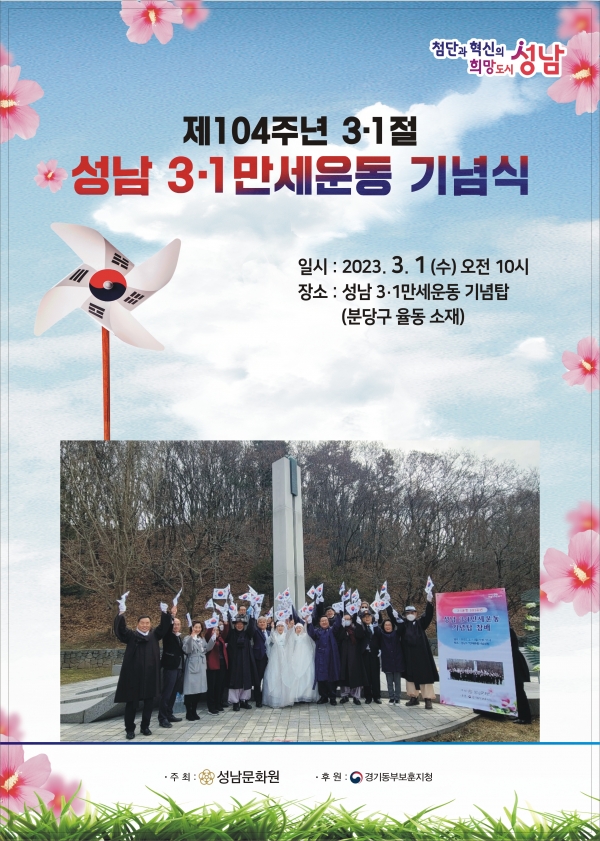 성남문화원(원장 김대진)은 3월 1일 오전 10시 분당구 율동   소재 ‘성남 3・1 만세운동기념탑’에서, ‘제104주년 3・1절’을 맞아 ‘성남 3・1 만세운동기념식'을 개최한다.