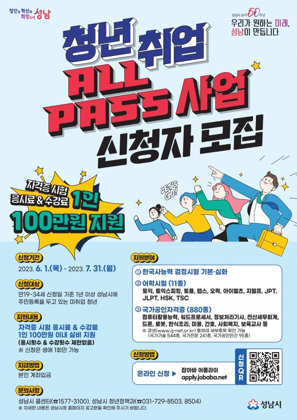 [광성일보] 성남시는 올해 100억5000만원을 투입해 미취업 청년에게 최대 100만원의 어학·자격증 시험 응시료와 학원 수강료를 지원하는 사업을 편다비슷한 사업을 시행하는 전국 지자체 중 가장 큰 규모의 지원금이다.성남시는 3월 2일 시 홈페이지에 이런 내용을 포함한 ‘청년 취업 올 패스(ALL-Pass) 사업 대상자 모집 공고’를 냈다.대상은 성남시에 1년 이상 거주한 만 19세 이상 34세 이하의 모든 미취업 청년이며, 올해 1월 1일 이후 시험 응시 또는 수강자가 해당한다.