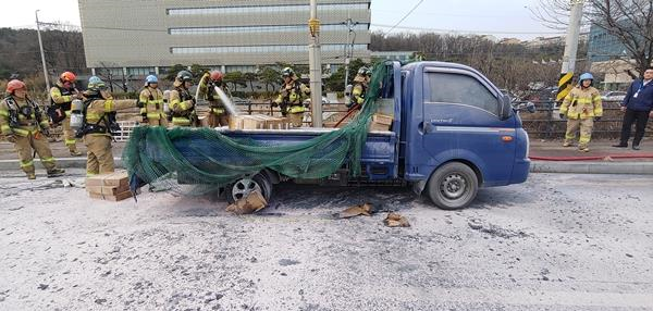 화물차량 운전자는 뒤차가 경적을 울려 사이드미러로 후방을 확인한바 불꽃과 연기가 발생하는 것을 발견했고 즉시 안전한 길가에 차량을 정차했다.