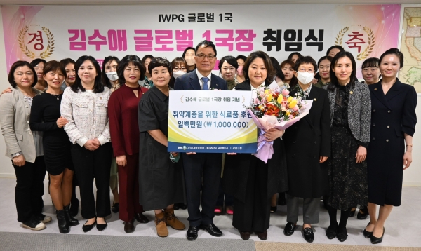 [광성일보] 사)세계여성(평화그룹 글로벌 1국(IWPG, 글로벌국장 김수애)은 3월 25일 오후 1시 강남지부 사무실에서 ‘글로벌 1국장 취임식 및 온리피스(Only Peace) 콘퍼런스’를 성황리에 마쳤다.이번 행사에서 글로벌 1국은 소외된 이웃들에게 조금이나마 힘이 되길 바라는 마음으로 ‘강남푸드지원센터(대표 김용희)’에 취약계층을 위한 식료품 후원금 100만원을 전달해 취임식의 의미를 더했다