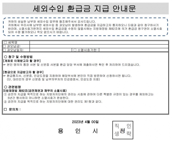 [광성일보] 용인시가 올해 상반기 세외수입에 대한 과·오납금 환급 집중 기간을 운영해 355건에 대해 1억여원을 환급한다고 27일 밝혔다.시는 지난 23일부터 다음달 28일까지 환급 집중 정리 기간을 운영해 환급금 존재 여부를 인식하지 못한 납세자를 대상으로 환급안내문을 발송하거나 직접 연락해 환급지급률을 높인다.