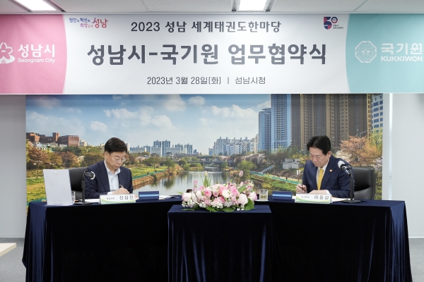 60개국 1만명 참여 규모의 세계태권도 한마당을 유치한 성남시가 성공적인 대회 개최를 위해 3월 28일 국기원과 공동 협약을 체결했다.