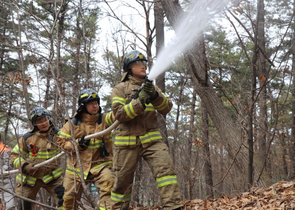 [광성일보] 성남소방서는 최근 빈번히 일어나는 산불화재에 대한 경각심을 고취하고자 현장대원 전원을 대상으로 산불화재 현지적응훈련을 실시했다고 28일 밝혔다.이번 훈련은 “야산에서 원인 미상의 화재가 발생하여 민가로 연소확대가 되고 있다.”는 가상상황을 만들어 출동부터 초기대응, 화재진압에 대한 훈련을 시행했다.