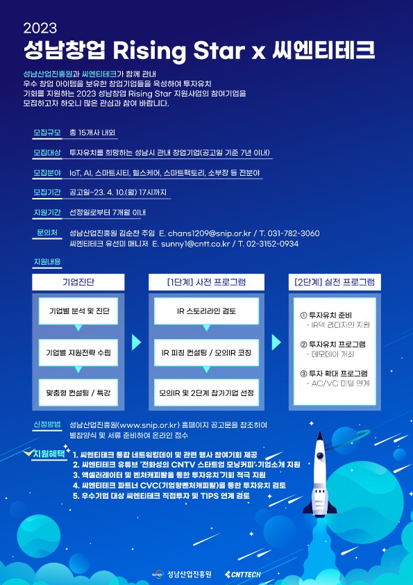 「2023년 성남창업 Rising Star × 씨엔티테크」는 성남산업진흥원과 TIPS운영사인 씨엔티테크가 함께 투자유치를 희망하는 성남시 관내 창업기업(공고일 기준 7년 이내)들을 선발하여 육성하는 사업이다.선정된 15개사 내외의 창업기업에는 진흥원에서 IR 제작 및 코칭, 우수기업 데모데이 참여, 투자 검토 등을 지원한다.또한 씨엔티테크 통합 네트워킹데이 및 관련 행사 참여기회 제공, 액셀러레이터 및 벤처캐피탈을 통한 투자유치 기회 적극 지원, 씨엔티테크 파트너 CVC(기업형벤처캐피탈)를 통한 투자유치 검토, 우수기업 대상 씨엔티테크가 최소 5,000만원의 직접투자 및 TIPS 연계 검토 등 다양한 혜택을 지원한다.