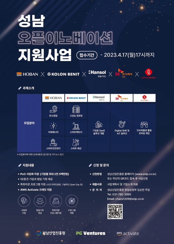 [광성일보] 성남산업진흥원은 ‘㈜호반건설, 코오롱베니트㈜, 한솔PNS IT서비스부문, SK(주) C&C, ㈜호텔롯데 롯데월드’와 함께 창업기업 간 사업협력을 통해 신기술 창출 및 개방형 혁신을 도출하기 위한 「2023 성남 오픈이노베이션」 지원사업의 참여기업을 내달 17일까지 모집한다.
