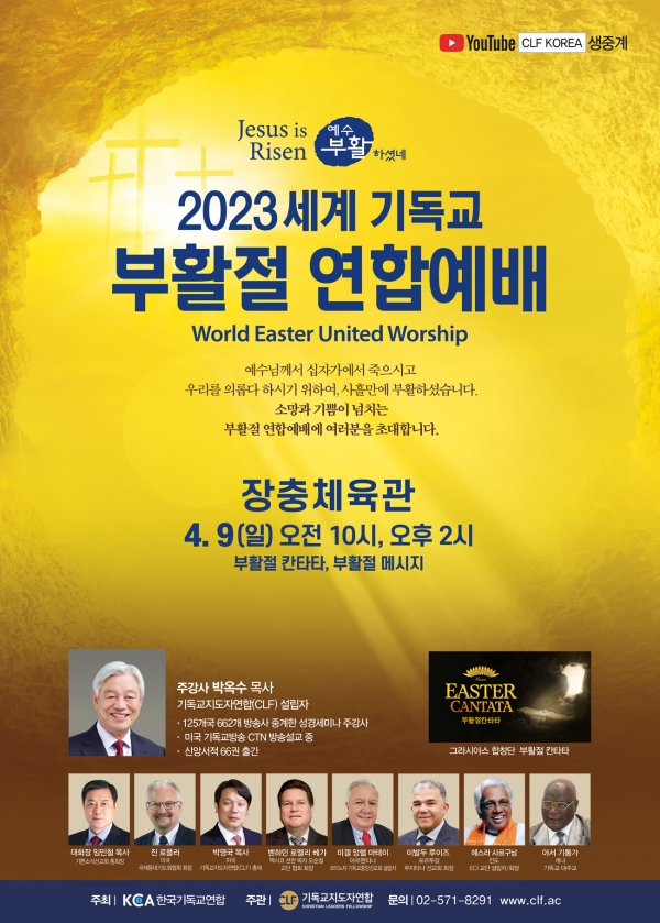 한국기독교연합(KCA)이 주최하고 범세계적인 목회자 단체, 기독교지도자연합(CLF)이 주관하는 ‘2023 세계 기독교 부활절 연합예배’가 서울 장충 체육관에서 개최된다.