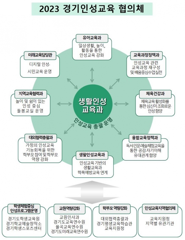 [광성일보] 경기도교육청(교육감 임태희)이 부서별 인성교육 정책 공유와 통합 지원을 위해‘경기인성교육 협의체’를 운영한다.도교육청은 생활인성교육과를 중심으로 ▲유아교육과 ▲교육과정정책과 ▲체육건강과 ▲융합교육정책과 ▲대외협력총괄과 ▲지역교육협력과 ▲미래교육담당관 8개 부서가 실무 협의체를 구성한다.