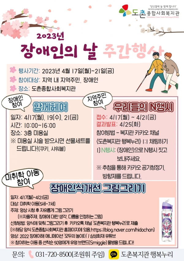 [광성일보] 성남 도촌종합사회복지관(관장 이종민)은 4월 20일 장애인의 날을 맞이해 주간행사로 4월 17일부터 21일까지 장애인식개선 및 장애인 인권증진을 위해 행사를 진행한다.