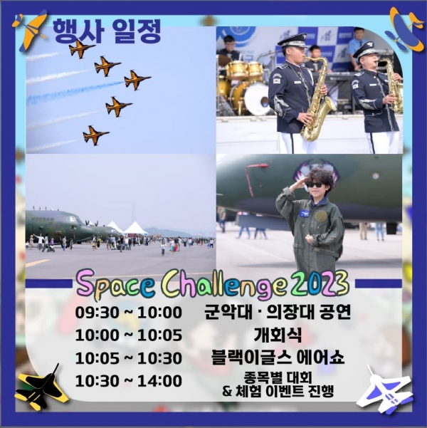 공군참모총장배 Space Challenge 대회’는 1979년 처음 개최하여 44년간 이어져 온 국내 최대·최고의 항공우주축제 중 하나이다. 대회는 초·중·고 학생들이 준비해온 고무동력기, 글라이더 등을 날리며 그동안 갈고닦은 기량을 겨루는 방식으로 진행된다.4월 23일(일) 진행될 서울·성남지역 예선대회는 세계적인 각광을 받고 있는, 대한민국 공군 특수비행팀 ‘블랙이글스’의 에어쇼와 공군 군악대 공연 및 의장대의 동작 시범 등 축하행사를 선보여 지역주민들과 함께하는 축제의 장을 만들어나갈 예정이다. 이밖에도 항공기 및 특수장비 전시행사를 비롯하여 페이스페인팅, 어린이 조종복 입기 체험 등 가족들이 함께 즐길 수 있는 다양한 볼거리와 이벤트가 마련된다.