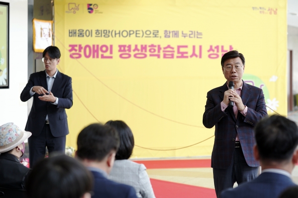 이날 행사는 신상진 성남시장과 성남시의회 의원, 장애인 기관·장애인 평생학습도시 사업 운영기관 관계자·학습자 등 30여 명이 참석해 장애인 평생학습도시 현판 제막식을 함께 했다.장애인 평생학습도시는 교육부가 지역을 기반으로 한 장애인 역량개발을 지원하고, 지역 중심 장애인 평생교육을 활성화하는 사업이다.시는 앞선 2월 교육부 국립특수교육원이 주관한 ‘장애인 평생학습도시 운영사업’ 공모에 선정돼 이번 현판과 국비를 받게 됐다.