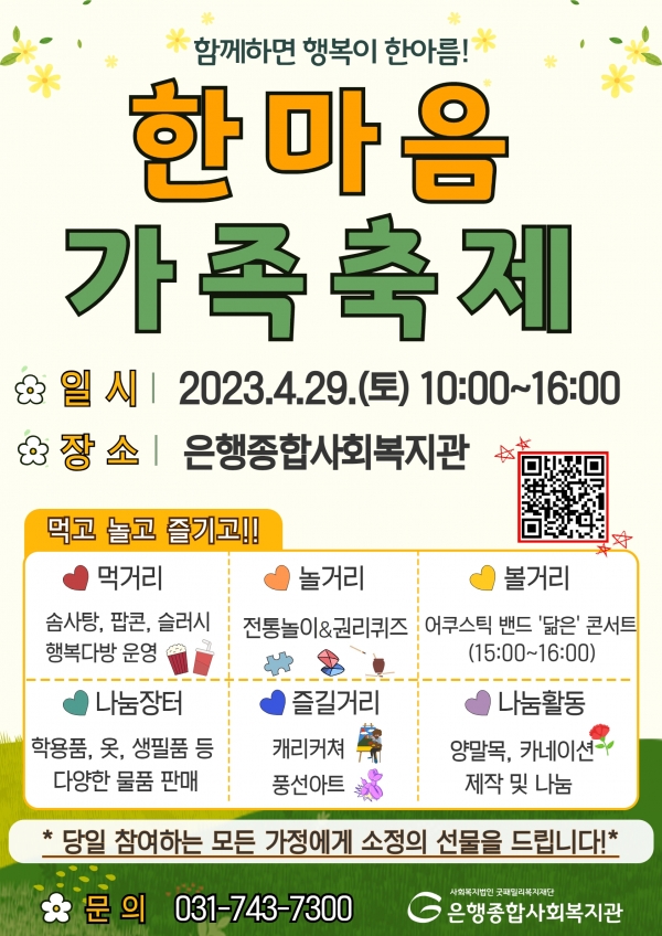 한마음가족축제는 가정의 달을 맞아 성남시 은행동에 거주하는 가족들을 위한 문화여가활동으로 가족 관계를 증진하는 다양한 놀이활동으로 진행된다.