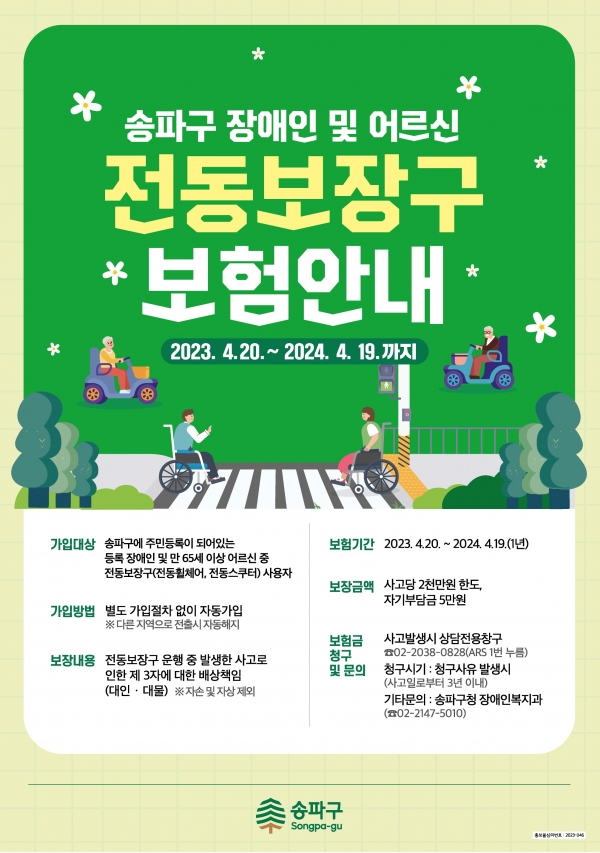 이에 송파구는 혹시 모를 사고로 장애인들이 갖게 될 심리적, 경제적 부담을 줄이기 위해 전동보장구 보험 가입을 추진했다. 구는 사고 피해자가 신속하게 손해배상을 받을 수 있도록 함으로써, 이용자들이 운행의 불안감을 덜게 되어 장애인의 이동권 보장과 사회활동 참여를 증진할 수 있을 것으로 기대하고 있다.보험기간은 2023년 4월 20일부터 2024년 4월 19일까지 1년간이다. 송파구에 주민등록을 둔 등록 장애인과 만65세 이상 어르신은 별도 가입절차 없이 자동으로 가입된다.보장내용은 전동보장구 운행 중 사고가 발생하여 타인을 다치게 하거나 재물을 손상한 경우 발생하는 배상책임에 대한 지원이며, 보장금액은 건 당 최대 2천만 원, 본인부담금은 5만원이다.