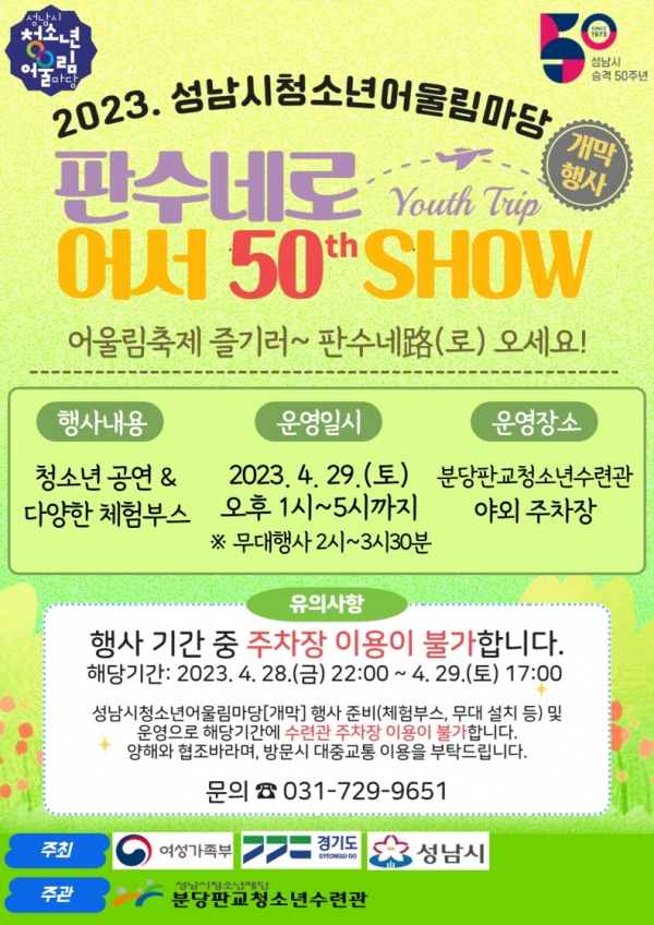 이번 『성남시청소년어울림마당』은 성남시 승격 50주년을 맞이해‘어울리GO~ 즐기GO~ Youth Trip, 어서 50th Show'를 슬로건으로 개최되며『성남시청소년어울림마당』‘판수네路 어서 50th Show(판수네로~ 어서 오십쇼)’개막행사에는 청소년 문화 기획단『T-ma!n(티메인)』 등 청소년들이 주도적으로 공연 및 체험 프로그램을 기획하고 운영한다.또한, 시승격 50주년을 기념해 성남시의 과거와 현재를 담은 사진 전시 및 이벤트가 마련될 예정이며 이외 판교25통이 함께하는 공방 체험활동, 지역주민들과 함께하는 플리마켓 등 다채로운 프로그램이 운영된다.
