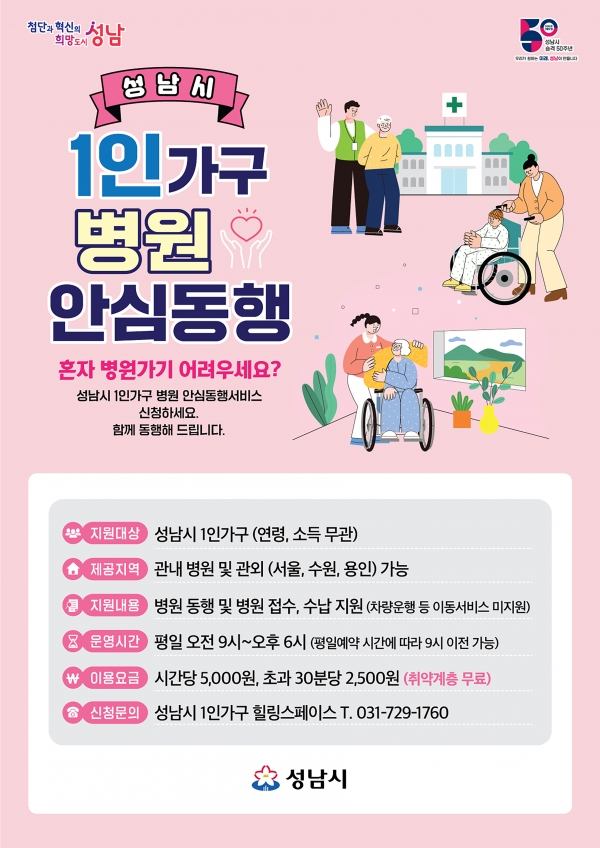 [광성일보] 성남시는 고령, 거동 불편 등으로 혼자 병원에 가기 어려운 1인 가구를 대상으로 오는 5월 8일부터 병원 안심 동행 사업을 편다. 시 관계부서로 전화(☎031-729-1760) 신청하면 동행인이 신청자 집을 찾아가 함께 병원에 가서 접수·수납 후 진료를 받고 집에 돌아올 때까지 모든 과정을 도와준다.