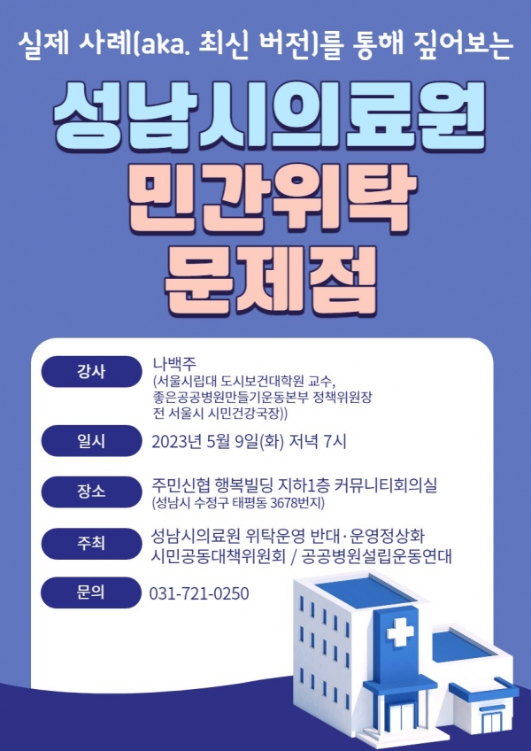 [광성일보] 성남시의료원 위탁운영 반대·운영정상화 시민공동대책위원회(상임대표 김용진 심우기 이상림 최재철)는 오는 9일 오후 7시 주민신협 행복빌딩 지하 1층 커뮤니티회의실에서 ‘성남시의료원 민간위탁 문제점’을 주제로 나백주(서울시립대 도시보건대학원) 교수 강연을 개최한다.