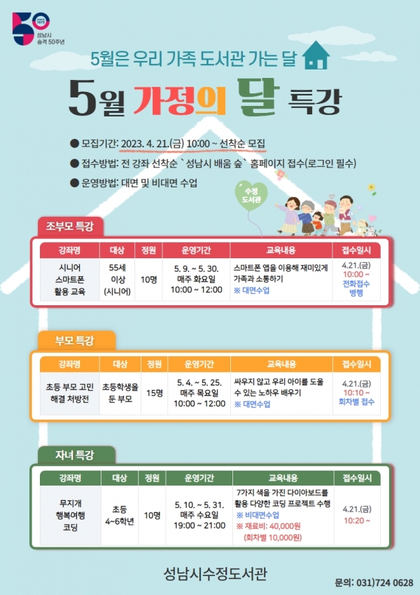 수정도서관이 5월 가정의 달을 맞아 오는 4일부터 31일까지 가정의 달 행사를 운영한다고 3일 밝혔다.