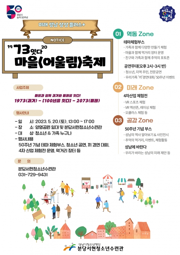 [광성일보] 성남시청소년재단 분당서현청소년수련관(관장 정은옥)에서는 시 승격 50주년을 기념하고자 청소년과 마을이 함께 공감, 역동, 미래로 도약하는 소통의 장을 마련하고 미래 50년의 발전 방향을 시민과 함께 나누는『미래성남상상플러스 1973잇다20 마을<어울림>축제』를 5월 20일 토요일, 양영공원 및 분당서현청소년수련관에서 개최한다.