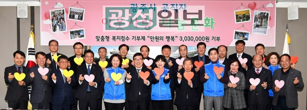 광주시와 광주시공무원노동조합이 ‘공직자 감성소나타’의 일환으로 맞춤형 복지점수 기부제인 ‘만원의 행복’을 실천, 어려운 시민과 함께 따뜻한 온정을 나눈다.