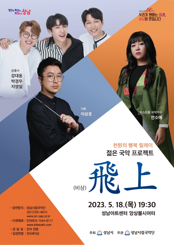 [광성일보] 성남시립국악단은 2023년 5월 18일(木) 오후 7시 30분 성남아트센터 앙상블시어터에서 천원의 행복릴레이 기획연주회‘飛上(비상)’을 공연한다.경제침체로 공연장을 찾지 못하는 시민들을 위해 다양한 프로그램으로 시민들에게 다가간다.젊은 국악 프로젝트 기획으로 국악과 트롯이 함께하여 객원지휘 이상호, 국악인 강승호 사회로 진행된다.