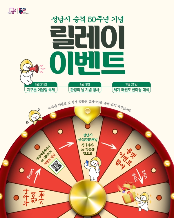 릴레이 홍보는 성남시가 연중 개최하는 10여 개 행사에 시 승격 50주년 홍보 부스를 설치해 운영하며, 시 공식 SNS 친구추가 등 이벤트 참여자에게는 룰렛 돌리기를 통해 당첨된 50주년 홍보 물품을 증정할 예정이다. 50주년 홍보 물품은 성남시 관내 우수 중소기업 제품을 포함해 일상생활에 꼭 필요한 다양한 물품으로 구성했다.