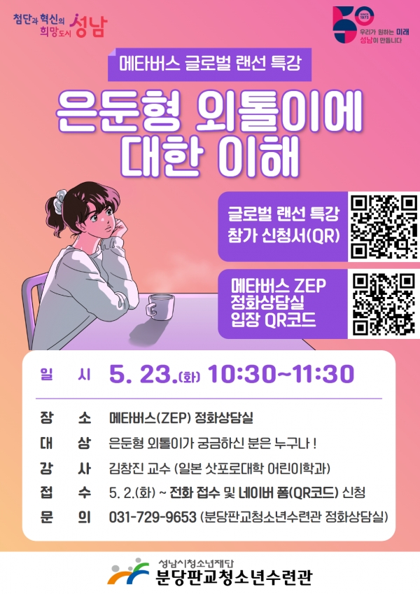 [광성일보] 성남시청소년재단 분당판교청소년수련관(관장 윤여원)은 최근 심각성이 대두되는 청소년기 사회적 고립 문제에 대응하고자 『은둔형 외톨이에 대한 이해』를 주제로 메타버스 글로벌 랜선 특강을 5월 23일(화)에 개최한다.