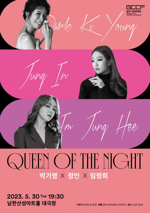 [광성일보] (재)광주시문화재단이 오는 5월 30일 남한산성아트홀 대극장에서 2000년대를 대표하는 보컬리스트 박기영, 정인, 임정희가 출연하는 ‘퀸 오브 더 나이트(Queen of the Night)’를 개최한다.○ 이번 공연을 위해 모인 박기영, 정인, 임정희는 개성 있는 보이스 컬러와 귀에 익은 히트곡들로 대중들에게 잘 알려져 있다. 이번 공연에서는 이들의 대표곡은 물론 듀엣 및 3명의 하모니를 느낄 수 있는 곡들도 함께 선보이며 오직 ‘퀸 오브 더 나이트’에서만 볼 수 있는 특별 콜라보 무대를 준비했다.