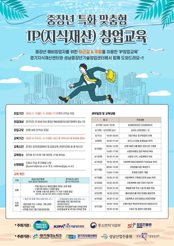 이번 교육은 중장년 기술 창업을 위한 ▲사업계획서 작성 ▲BM설계 실습 ▲마케팅 홍보 전략과 IP(지식재산) 창업을 위한 ▲아이디어 구체화 ▲특허연구 ▲브랜드 개발 등의 내용을 담고 있다.오프라인 교육은 6월 7일부터 27일까지 평일 저녁과 토요일 총 42시간 진행되며, 온라인 교육(12시간)과 그룹 멘토링 1회(2시간)도 제공된다.전액 무료로 진행되는 이번 교육 참가자 모집기간은 5월 30일 17시까지이며 선착순 20명 내외로 모집할 예정이다.수료생에게는 중장년 기술창업센터와 경기지식재산센터에서 각각 교육 수료증을 발급한다.