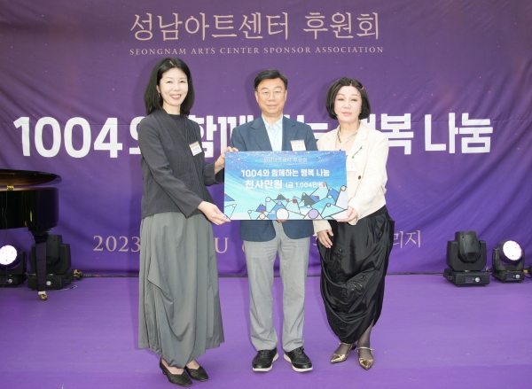 [광성일보] 성남아트센터 후원회(회장 박지향)가 모든 시민이 문화로 풍요로워지길 바라는 마음을 담은 후원금을 전달했다.성남아트센터 후원회는 6월 1일(목), 분당구 서현동 유엔젤 빌리지에서 성남문화재단 이사장인 신상진 시장과 성남문화재단 서정림 대표이사, 성남아트센터 후원회원 등 60여 명이 모인 가운데 ‘1004와 함께하는 행복나눔’ 행사를 개최했다.