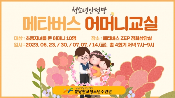 이번 [메타버스 타 go, 상담해 yo!]‘어머니교실’은 지난 5~6월, 4회기에 걸쳐 진행된 ‘메타버스 아버지 교실’에 이어 기획되었으며, 남진우 임상심리사가 교육을 진행한다. 진행은 메타버스 정화상담실에서 비대면으로 진행된다.지난 ‘메타버스 아버지 교실’에 참여한 김희민(가명, 야탑동) 씨는 “다양한 사례를 통해 자녀의 기질 및 성격에 대해 이해할 수 있었고 실제 자녀 양육에 큰 도움이 되었다.”며 소감을 전했다.분당판교청소년수련관 김정화 상담사는“상담은 개인적이라 단체 교육에는 일정 부분 한계가 있을 수밖에 없지만, 메타버스를 통해 이러한 제약 및 시공간적 한계를 극복할 수 있었다.”라고 밝혔다.