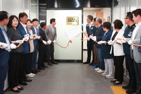 이 시장은 “취임 1년 동안 많은 활동을 하도록 함께 힘과 지혜를 모으고 도와줘 감사하다. 앞으로도 용인특례시 공직자들이 어느 부서에서 일하든 좋은 환경에서 근무하도록 노력하겠다. 새로운 공간에서 멋진 활동 해주길 기대한다”고 말했다.강 위원장은 “지난 5년간 창문 하나 없는 열악한 사무실에서 어렵게 노조를 이끌어왔지만 이상일 시장님이 사무실을 이전하는 데 많은 관심과 협조를 해줘 진심으로 감사하다”며 “앞으로도 조합원들의 근무조건 개선과 시민 삶의 질을 높이는 데 용인특례시공무원노동조합이 중심에 서겠다”고 말했다.강 위원장의 기념사가 끝나자 노조원들은 사무실 이전을 위해 애써준 이 시장에게 박수갈채를 보내며 환호했다.이 시장도 자리에서 일어나 손을 흔들며 화답하고 이동읍 소재 영보자애원 수녀들이 직접 그린 미술품을 사무실 확장 이전 기념 선물로 건넸다.