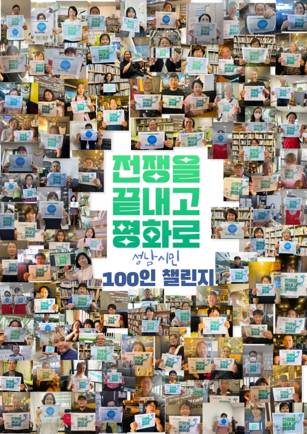 성남시민들의 평화와 통일을 바라는 염원을 모아내고자, “전쟁을 끝내고 평화로” 라는 행사의 슬로건에 맞춰 지인들의 지목을 받아 인증샷을 찍어 SNS에 올리는 챌린지를 진행하였고, 100명의 시민사회단체 회원과 성남시민들이 참여했습니다.