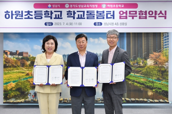 [광성일보] 성남시는 분당지역에만 있는 학교돌봄터(1~4호점)를 중원지역에도 설치해 방과후 초등학생 돌봄 지원에 나선다.시는 7월 4일 오전 11시 시청 4층 상황실에서 신상진 성남시장과 오찬숙 경기도성남교육지원청 교육장, 김충민 하원초등학교장 등이 참석한 가운데 ‘학교돌봄터 5호점 설치·운영 사업에 관한 업무협약’을 했다.협약에 따라 오는 12월 중원구 금광1동 하원초등학교 체육관동 1층에 초등학생 60명이 이용할 수 있는 학교돌봄터가 설치·운영된다.