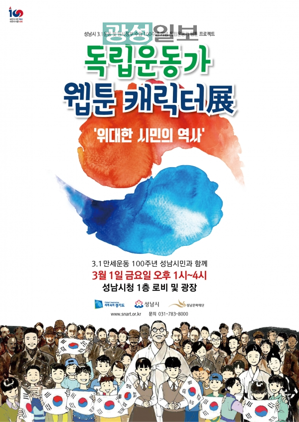 성남문화재단(대표이사 박명숙)은 오는 3월 1일(금), ‘성남시 3.1운동 및 임시정부 수립 100주년 기념 독립운동가 웹툰 프로젝트(이하 독립운동가 웹툰 프로젝트)’의 일환으로 <독립운동가 웹툰 캐릭터展: 위대한 시민의 역사>를 성남시청 1층 로비에서 개최한다.