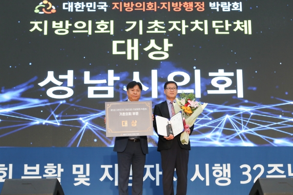 성남시의회(의장 박광순)는 8일 대전컨벤션센터에서 열린 ‘제5회 대한민국 지방의회·지방행정 박람회’ 시상식에서 기초의회 부문 대상을 받았다.