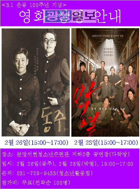 2월 26일(화)부터 3월 10일(일)까지 12일간 체험·전시·영화 상영회가 진행 되오니 참여를 희망하시거나 문의사항은 분당서현청소년수련관 청소년활동팀(031-729-9436, 729-9435)에 문의하면 된다.