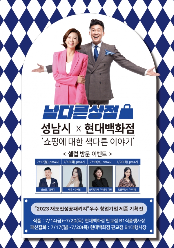 또한 라이브커머스 방송과 행사장 셀럽방문 이벤트도 준비되어 있다.개그맨 홍록기, 배우 강예빈, 분따(분당,판교,위례 따라잡기) 대표 박은정, 인플루언서 최라벨 등의 셀럽들이 기간 중 라이브커머스 방송은 물론 행사장을 방문해 성남시 중소기업을 위해 힘을 보탤 계획이다.한편, 성남시-현대백화점 협력 ‘남다른상점’은 지난 2019년을 시작으로 올해로 7번째 행사를 개최하며 오는 11월 또 한 차례의 행사가 열릴 예정이다.