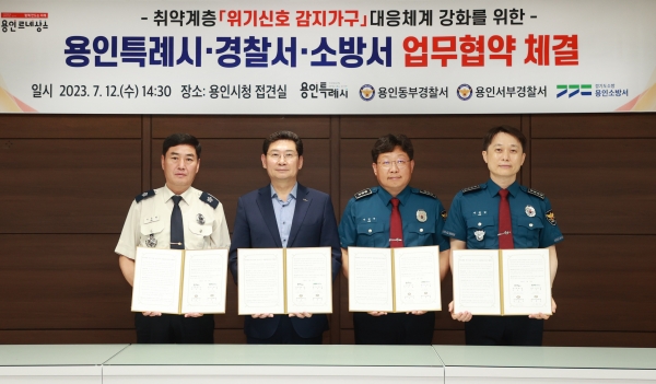 [광성일보] 용인특례시(시장 이상일)가 지역 내 경찰·소방과 함께 취약계층이 겪을 수 있는 위기상황을 사전에 차단하고 신속한 지원과 구조활동을 할 수 있는 협업체계를 구축했다.시는 지난 12일 용인동부경찰서, 용인서부경찰서, 용인소방서와 함께 용인특례시청 접견실에서 '취약계층 위기신호 감지가구 공동대응 업무 협약'을 체결했다.협약식에는 이상일 용인특례시장과 서승현 용인소방서장, 이종길 용인서부경찰서장, 이민수 용인동부경찰서 112치안종합상황실장이 참석했다.