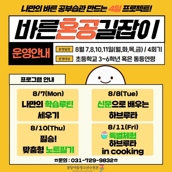 성남시청소년재단 분당야탑청소년수련관(관장 정영숙)은 8월 7일부터 여름방학 특강, 초등 청소년 자기주도학습 행동코칭 프로그램인 『바른혼공길잡이』를 운영한다.
