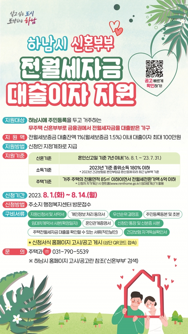 지원 대상자는 하남시에 주민등록을 두고 거주하는 무주택 신혼부부 중 금융권에서 전월세자금 대출을 받은 신혼부부(혼인신고일로부터 7년 이내 한정)로, ▲공고일 기준 부부 및 세대원 전원이 무주택자 ▲기준 중위소득 180% 이하 ▲하남시에 소재한 주택 전용면적 85㎡ 이하 ▲전세전환가액 6 억원 이하 등의 요건을 충족해야 한다.요건을 모두 충족한 대상자는 대출잔액 1% 이내(월세보증금 1.5%)에서 대출이자를 연 1회, 최대 100만원까지 지원받을 수 있다.