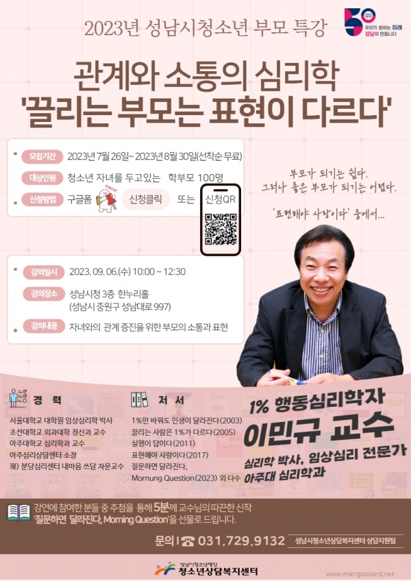 특강의 강연자로는 아주대학교 심리학과 이민규 명예교수가 진행을 맡는다. 이민규 교수는 ‘1%행동심리학자’로 알려져 있으며, 조선대학교 의과대학 정신과 교수를 거쳐 아주대 심리학과 교수 및 아주심리상담센터 소장 역임, 분당심리센터 내마음쓰담 자문교수, 《끌리는 사람은 1%가 다르다》《실행이 답이다》《1%만 바꿔도 인생이 달라진다》《생각의 각도》《표현해야 사랑이다》《질문하면 달라진다》등 다수의 베스트 셀러를 집필했다.특강 신청은 7월 26일부터 선착순으로 모집하며, 성남시청소년재단 홈페이지(청소년상담복지센터>열린마당>공지사항) 및 온라인(https://forms.gle/bcnYZ6AHd3F7CK4E9,) 등에서 신청 가능하다.
