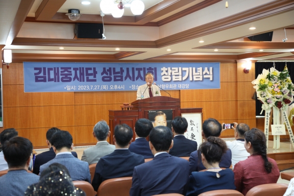 [광성일보] 김대중 대통령의 철학과 사상을 세우고 한반도 평화와 아시아 민주화에 기여한 업적을 계승 발전시키기 위한 김대중재단 성남시지회(지회장 백왕순) 창립기념식이 27일 오후 4시 성남시호남향우회관 대강당에서 열렸다,이날 창립식에는 권노갑 이사장(민주당 상임고문)을 비롯해 문희상 상임부이사장(전 국회의장), 배기선 사무총장, 백학순 김대중학술원장 등을 비롯해 성남시호남향우회 김종술 회장과 최대호 의장, 김대중재단 성남시지회 백재기 자문단장 및 고문단, 양 호 자문단, 각 분과위원회 등 200여 명이 참석, 김대중 정신을 계승, 축하하는 자리를 마련했다.