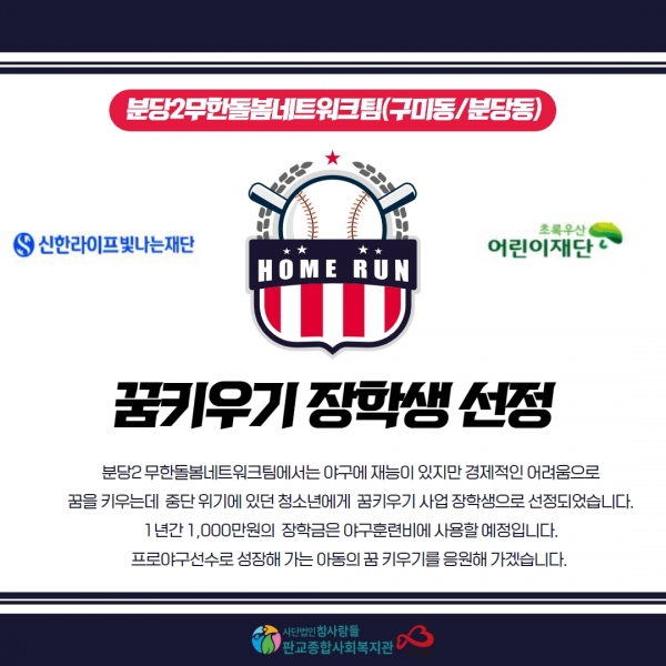 [광성일보] 성남시 분당2 무한돌봄네트워크팀(판교종합사회복지관)은 신한라이프빛나는재단이 지원하는 ‘2023 신한라이프장학프로그램 꿈키우기’에 선정되어 2023년 8월 중 장학금 1,000만원을 지원받을 예정이다.
